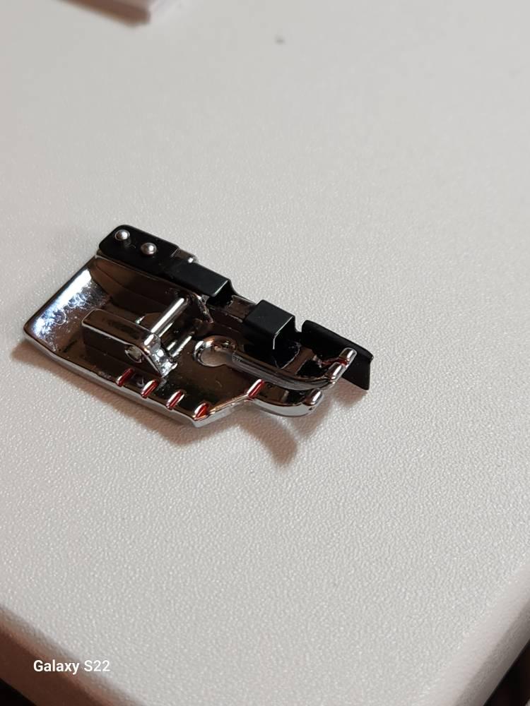 This Snap-On 1/4" quilting foot with guide, compatible with various machine models and featuring spring and red line gauges, works with a 7 mm wide zigzag stitch. Made by Alphasew, part # P60618.