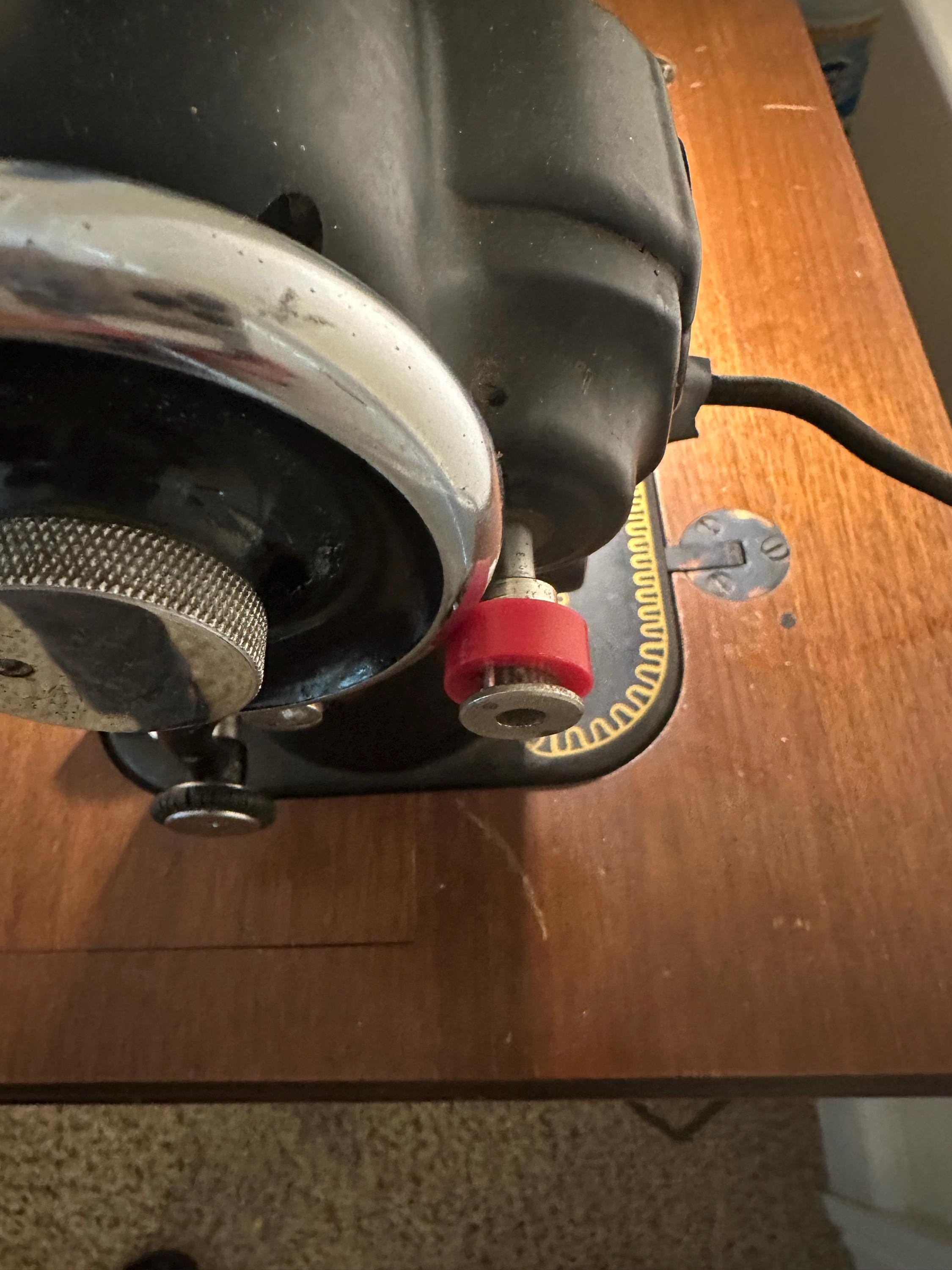Friction drive motor pulley with 6 bobbins and a bobbin winder tire.
